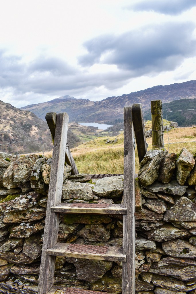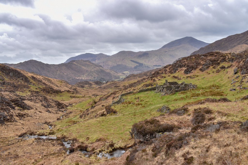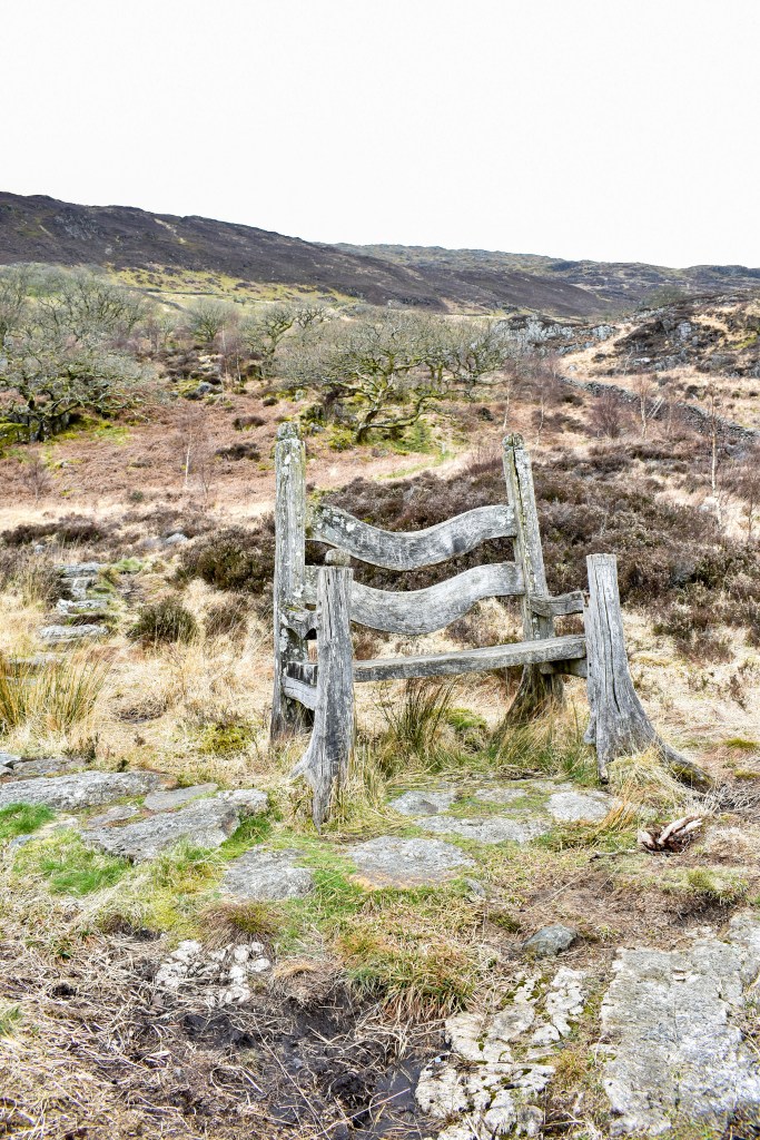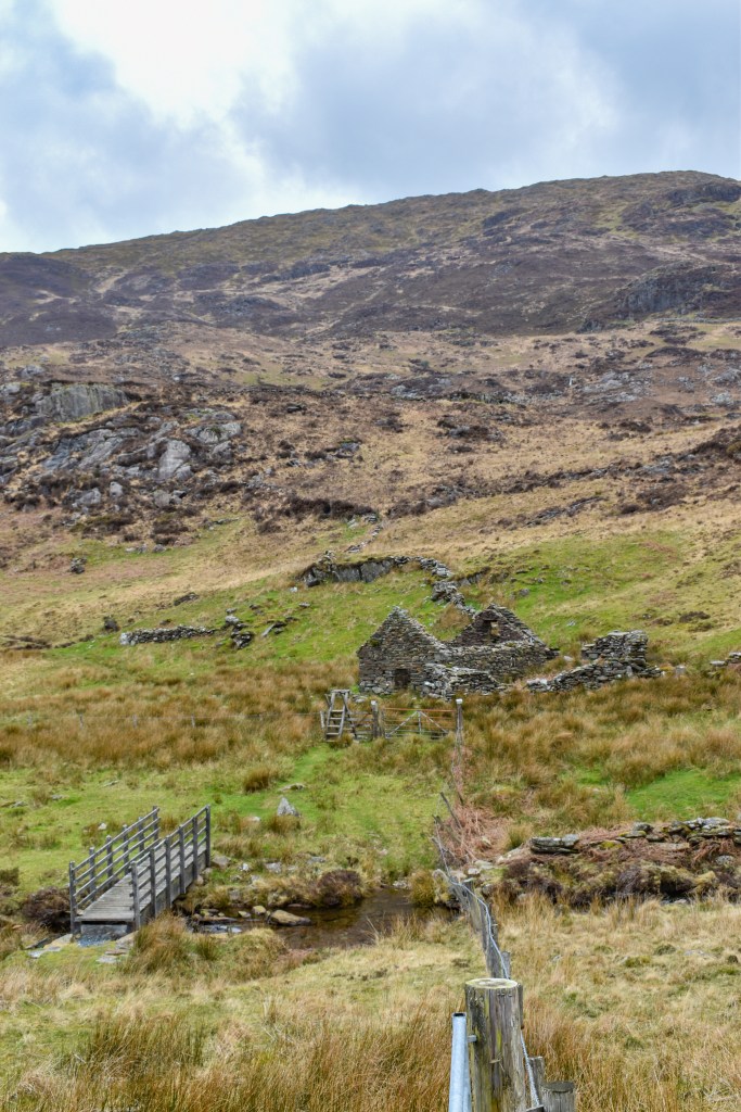 Pause to take in the views of Sygun Copper Mine directly ahead from the Giant’s Chair on your right. Then, continue to the left and climb up some steps, ignoring the stile on your right. Follow the winding path upwards, crossing a small stile over a fence, and head towards the ffridd. Proceed east towards Bylchau Terfyn. Cross another stile at the wall and keep following the black waymarkers. When you reach a bridge near an old ruin, turn left onto a track and keep heading upwards.