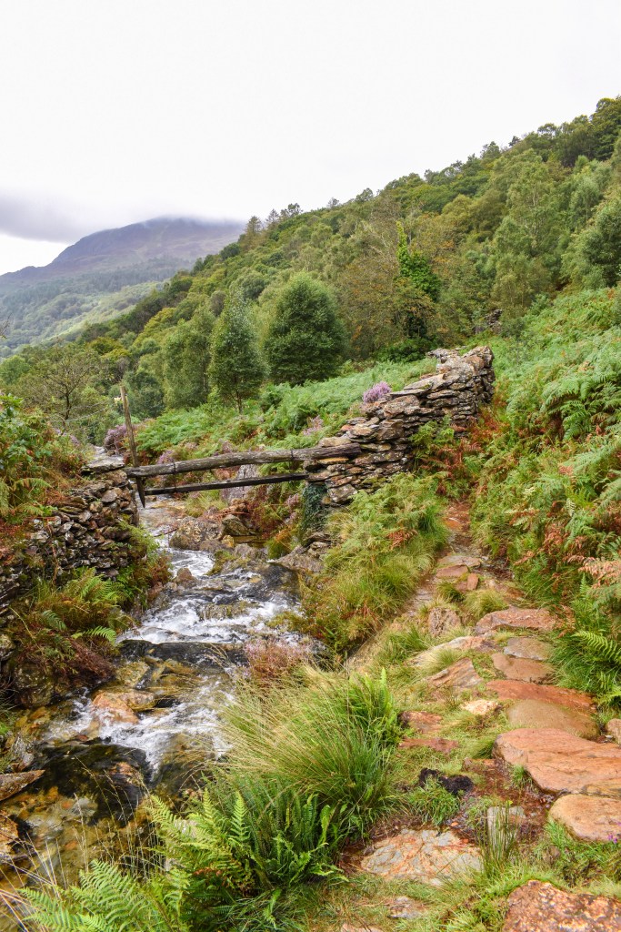You start this hike at the small National Trust Car Park (Pay and display) in Nantmor. Start the trail by passing through a gate near the toilet block and turn right to walk under the Welsh Highland Railway. Continue ahead to a path which makes it way up the little valley of Cwm Bychan. Follow the path through the woods and you will come to a stream on your right. Continue following the obvious stoney/dirt path till you reach a bench near a stoned wall, there’s a gap in the wall to the right. This path continues up the valley passing numerous remains from mining in the area and rusting supports of an old cableway.
