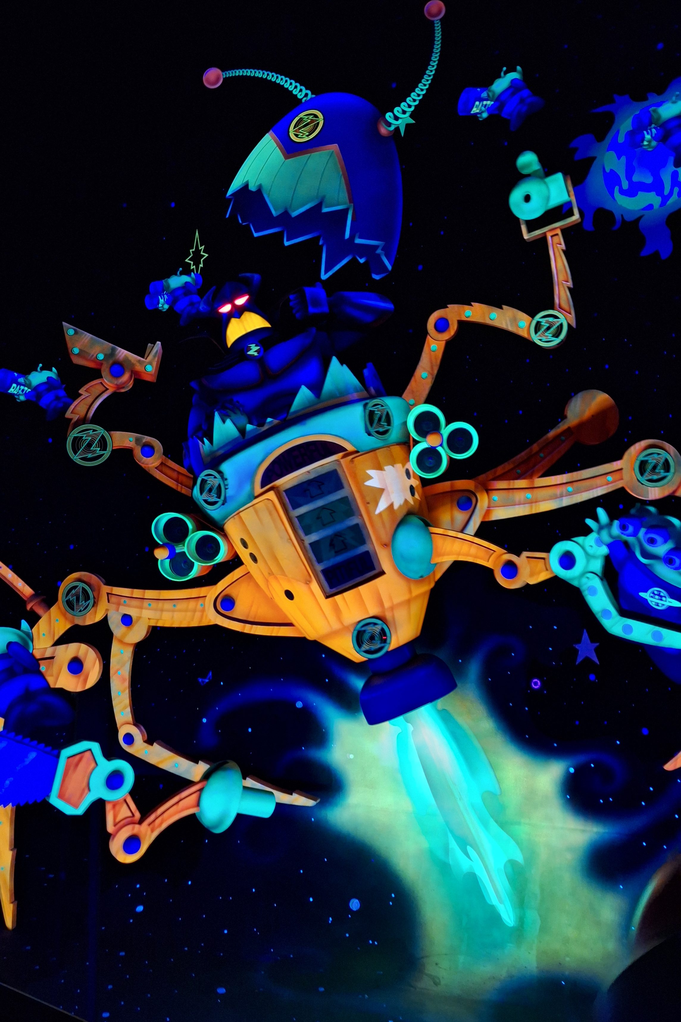 We stopped for lunch at Docking Bay 7 and enjoyed a tasty beef, rice, and veggie dish—a refreshing change from the usual burgers and chips. After refuelling, we made our way to Toy Story Land and jumped on Toy Story Mania, which was an absolute blast! It’s a fast-paced 4D shooting game where you zip through different scenes, firing at colourful targets. Next up was Alien Swirling Saucers. I was a bit hesitant, as I’m prone to motion sickness, but it was surprisingly gentle.
